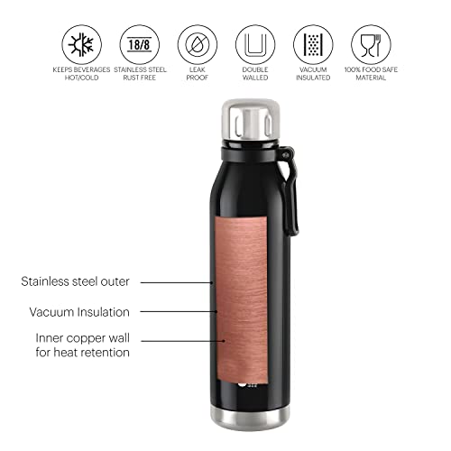 Heat Retention: Double walled Vacuum insulated technology keeps beverages hot or cold for 24 hours, Inner copper coating for better temperature retention with thermoseal technology.