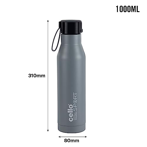 Cello Maestro Stainless Steel Vacuum Insulated Flask | Hot & Cold Water Bottle with Screw top Lid | Double Walled Water Bottle for Sports, Gym, Outdoor, Travel | Grey | 1000ml