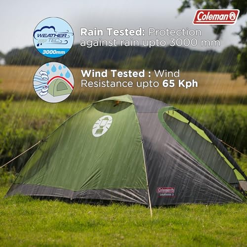 Coleman Darwin tents comes with patented Weather Tec – Waterproof system offering comfort and protection when enjoying in outdoors. These tent series are tested for rain and wind providing water column of 3000 mm and upto 65 kph of wind resistance