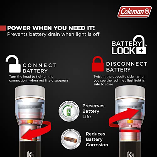 Compact yet bright, this lightweight, aluminium divide+ 200 led torch emits a powerful 200 metre light beam and features the advanced battery lock system. The batteries in standard electric lights lose battery power over time, even when the light is turned off, because the batteries are still connected to the electronic circuit. With patented, Coleman battery lock technology and the simply twist of the flashlight head, residual battery drain is no longer a problem.