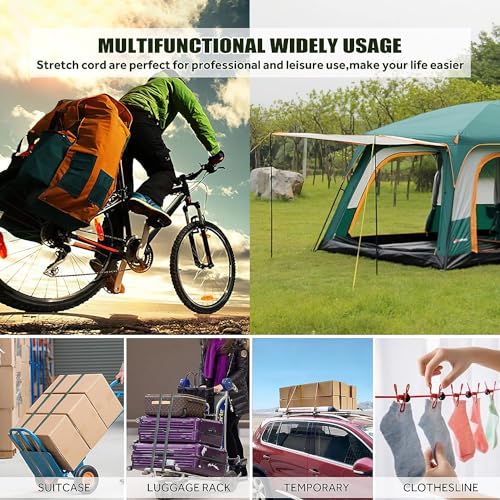 MULTIFUNCTIONAL WIDELY USAGE: These with galvanized metal hooks,sturdy and antirust, can lock onto the anchor point and won’t bend or break.Adjustable elastic rope can meet many different needs. It can be used not only to fix mobile boxes and luggage rack, but also to fix trash cans, camping, tents, heavy objects, tarps, clotheslines, gardening and others outdoors. elastic band outing activities make your life easier,stretch cord are perfect for professional and leisure use.