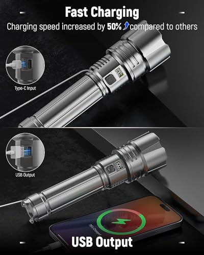 Specification: Kresal 250000 High Lumens LED Torch with Power Display,Super Bright Rechargeable Flashlight,Type-C Fast Charging Flash Light with 5 Modes, IPX6 Waterproof Durable Torches for Camping Hiking Emergency