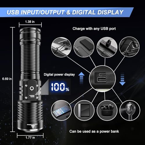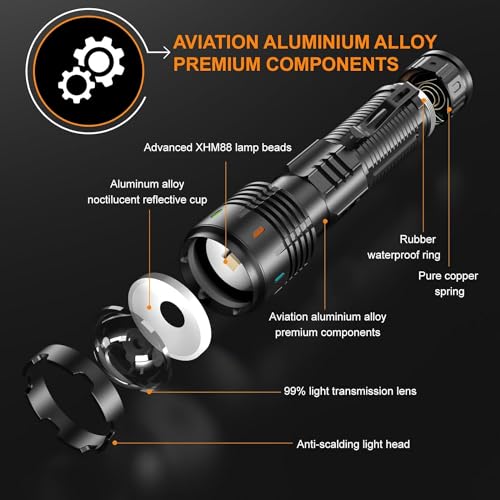 🔦【Powerful Illumination】: With a maximum output of 200000 lumens, this tactical flashlight provides super bright illumination for all your outdoor activities.