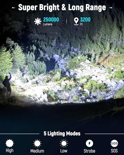 - Powerful Illumination : With a maximum output of 200000 lumens, this tactical flashlight provides super bright illumination for all your outdoor activities.