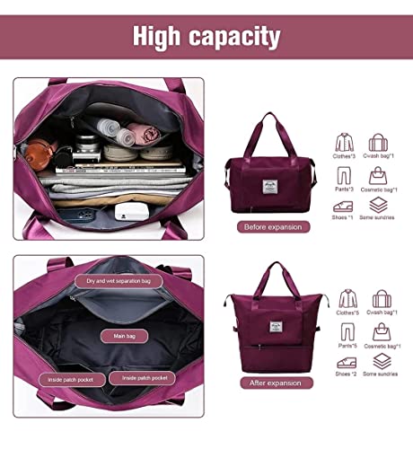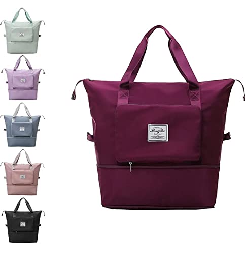 Large Capacity Folding Travel Bag, Foldable Travel Duffel Bag, Dry and Wet Separation Sports Portable Shoulder Bag, Travel Lightweight Waterproof Carry Luggage Bag (Wine)