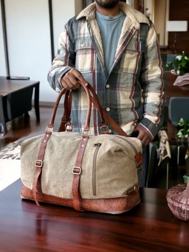 Maymith Canvas/Genuine Leather Duffel Bag for Travel/Stylish Overnight Bag/Gym Bag for Men and Women Color-Tan/Khakhi (Capacity 40 Ltrs)