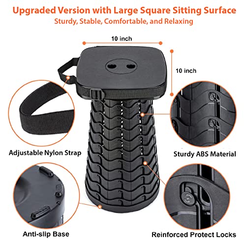Large Square Surface to Sit on, More Stable and Comfortable, Sturdy and non-slip, 485lbs load capacity, Portable, retractable and Collapsible Telescoping Stool for Camping, Hiking, Fishing, BBQ, Compact and Lightweight, Easy to carry in backpack, by hand, or shoulder