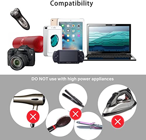 Rated power: 110V~/650W, 220V~/1300W. Power output: 100-240VAC~50-60HZ 6A Max. Only apply to the use of small power electric appliances when traveling, such as mobile phone, digital products, computer with low power of small household appliances.The travel adapter does not work with high power appliances such as hair straightener, flat iron, hair curler, hair dryer, steam iron, hot water heater, coffee maker, etc.
