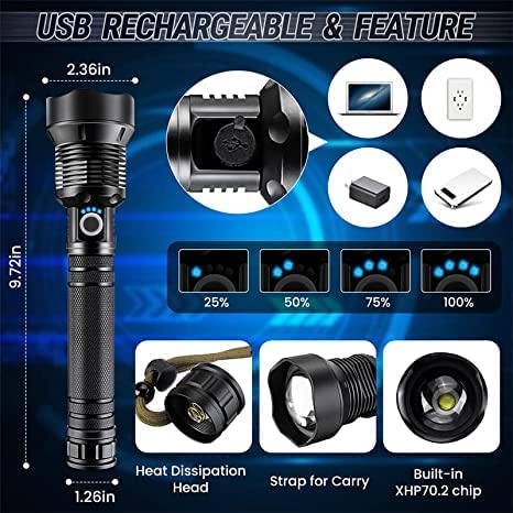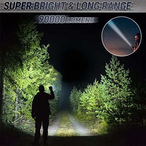 Specification: Super Bright Rechargeable LED Flashlights, Torch 90000 Lumen XHP 70.2 Tactical Flashlight, Zoomable & IPX5 Waterproof, Aluminum Torch